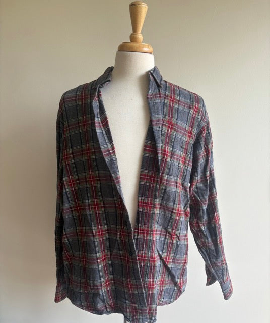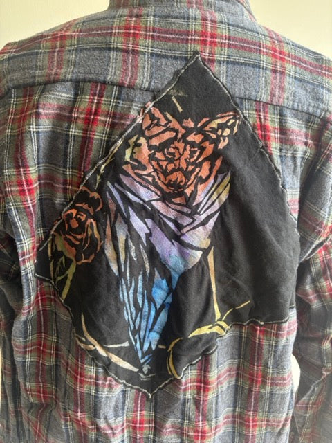 All of the flannels are vintage and up-cycled into a wearable piece of art. They are one of one. It is all my original art and I hand paint the back patches, which are then hand sewn onto the backs of each flannel!