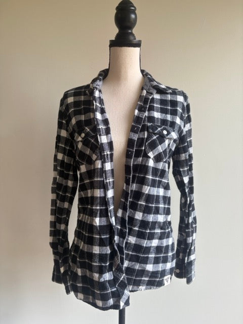 All of the flannels are vintage and up-cycled into a wearable piece of art. They are one of one. It is all my original art and I hand paint the back patches, which are then hand sewn onto the backs of each flannel!