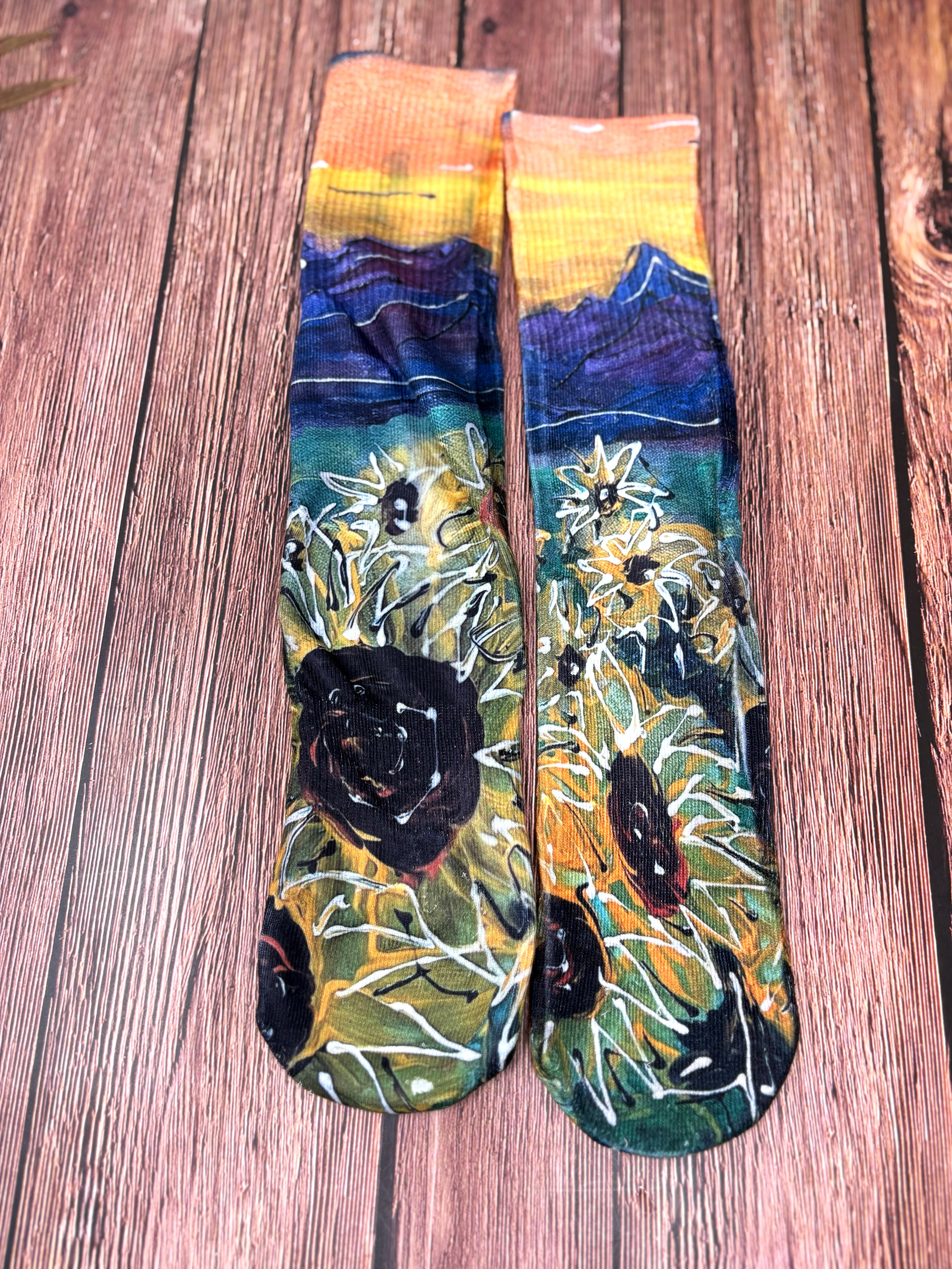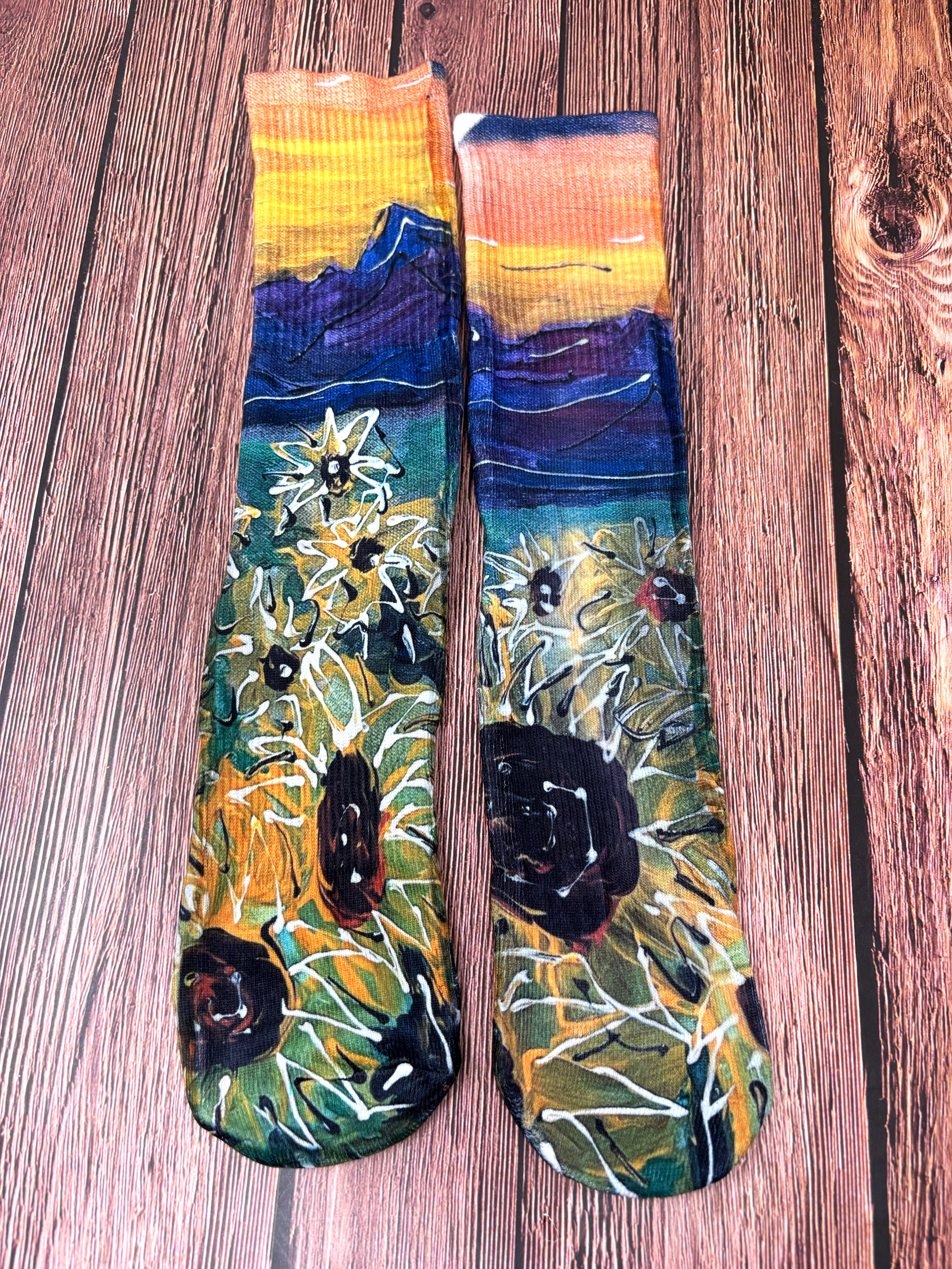 The designs are my original artwork, which are then printed onto sublimation paper - and I use a heat press to dye the fabric - socks!